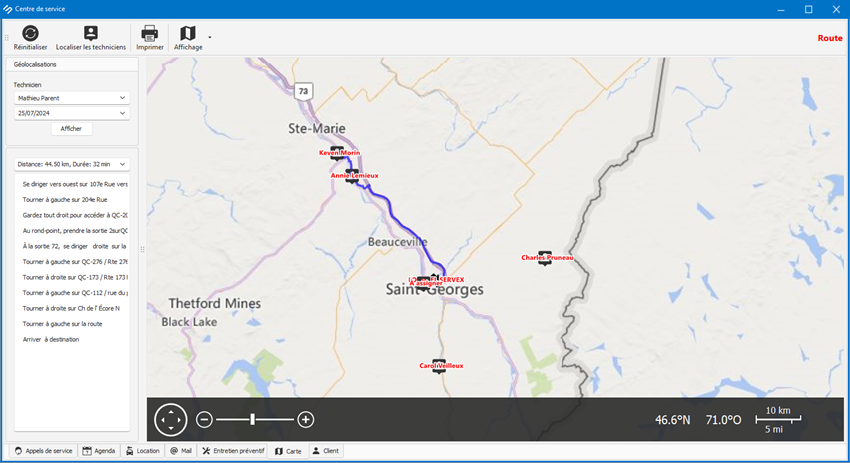 localisation de vos techniciens sur route, le trajet à effectuer pour se rendre