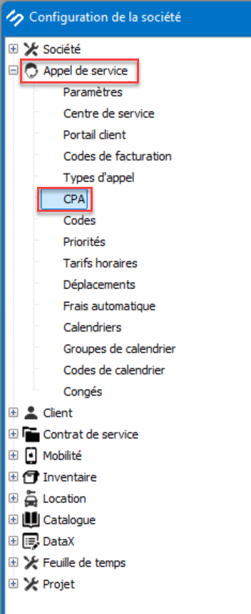 Utilitaires > Configuration de la société > Appel de service > CPA