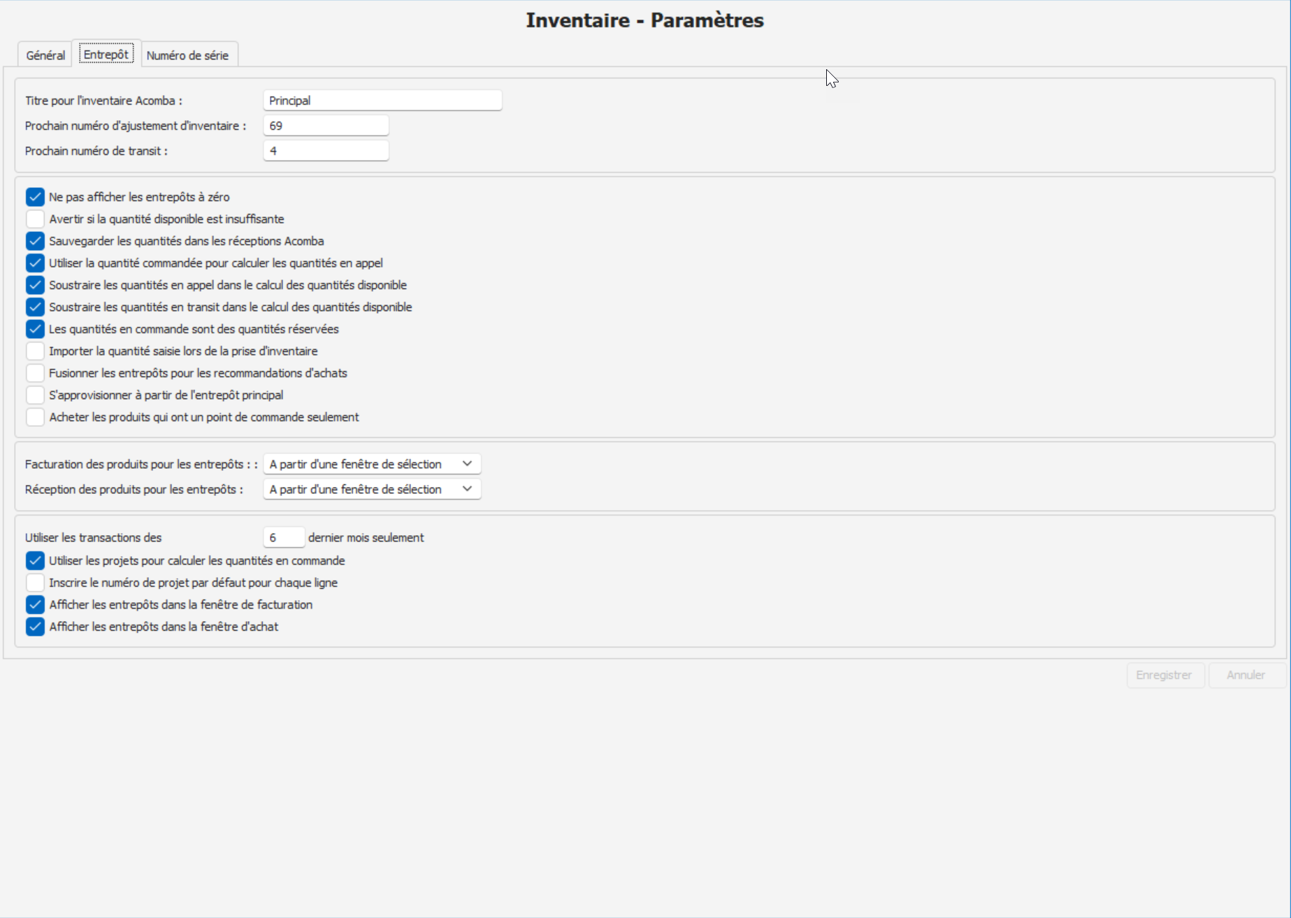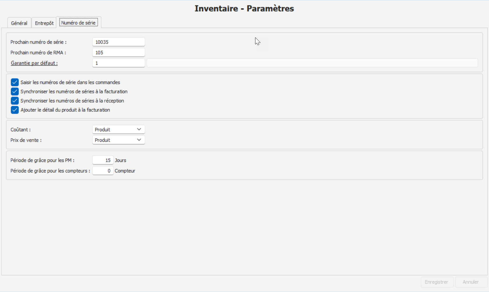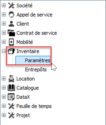Utilitaires > Configuration de la société > Inventaire > Paramètres