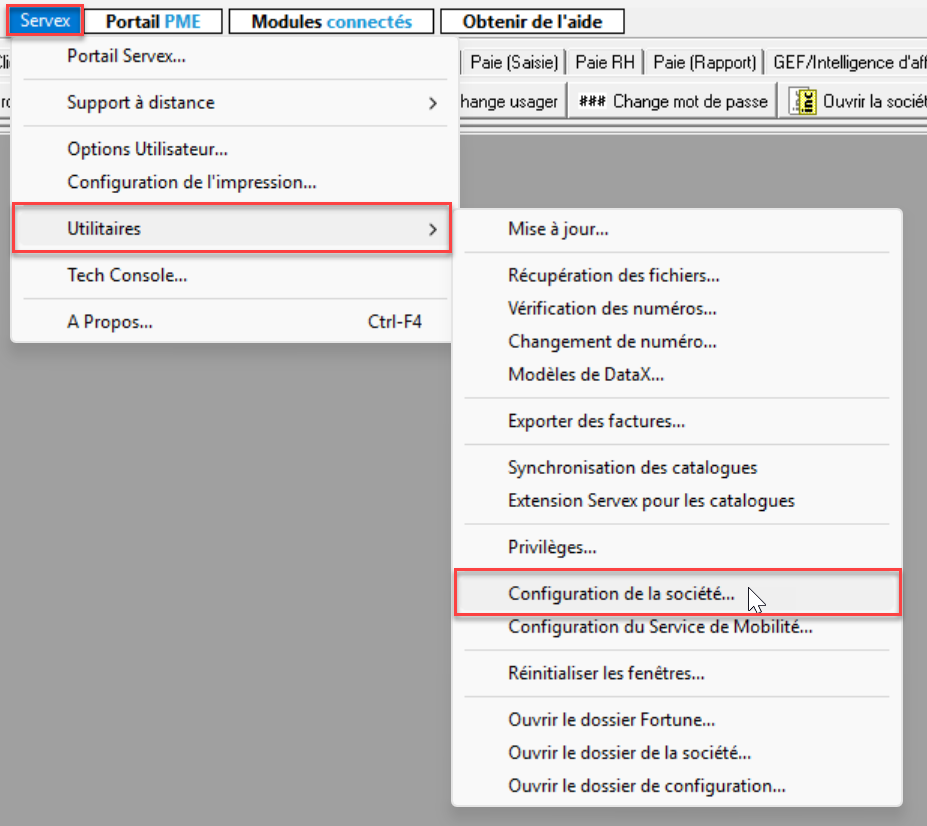 Dans le menu Servex, allez à :