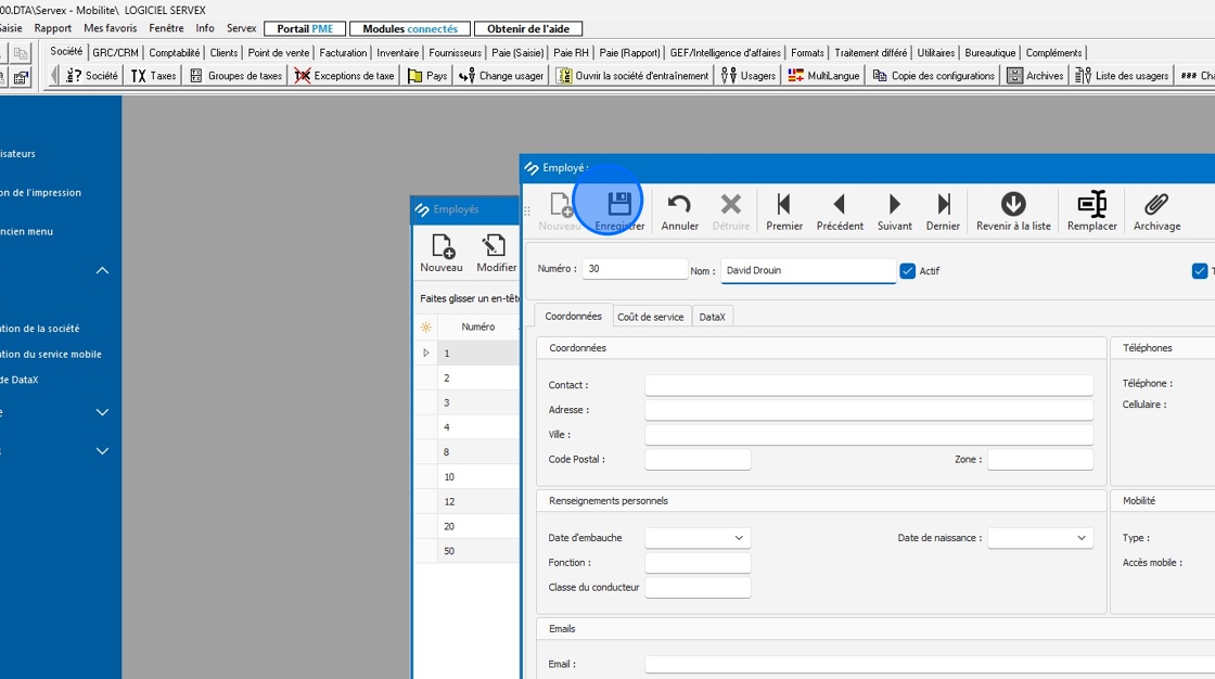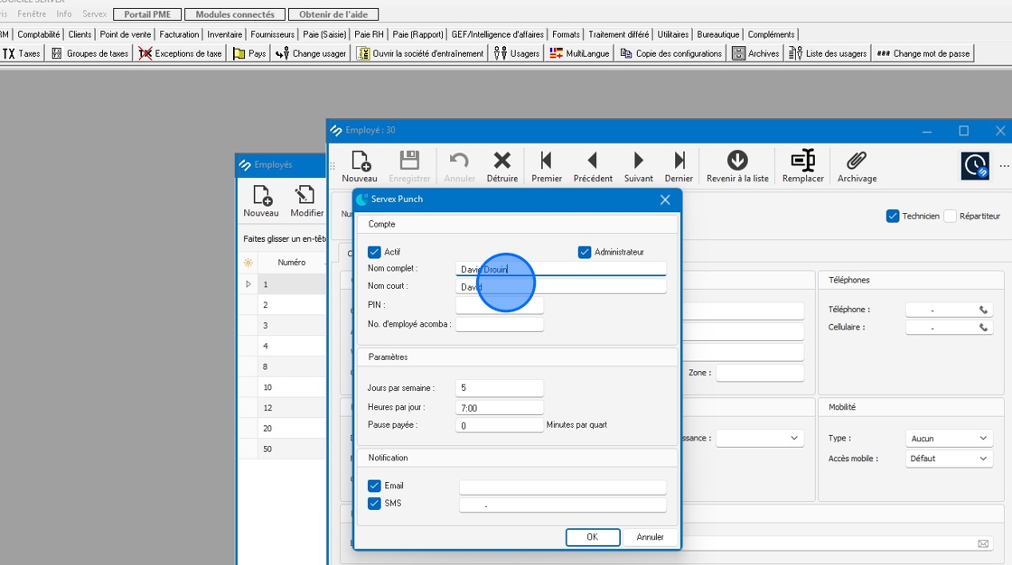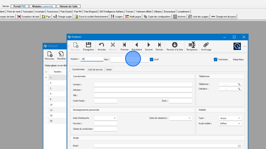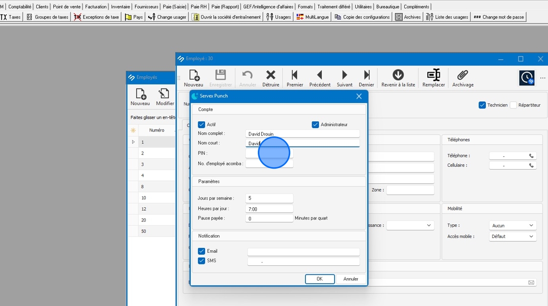 14. Inscrivez le numéro de l'employé Acomba (nécessite le module Paie d'Acomba)