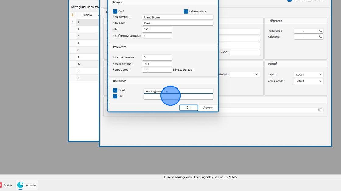 18. Si vous désirez que l'employé reçoive des notifications, inscrivez son courriel et/ou son numéro de cellulaire