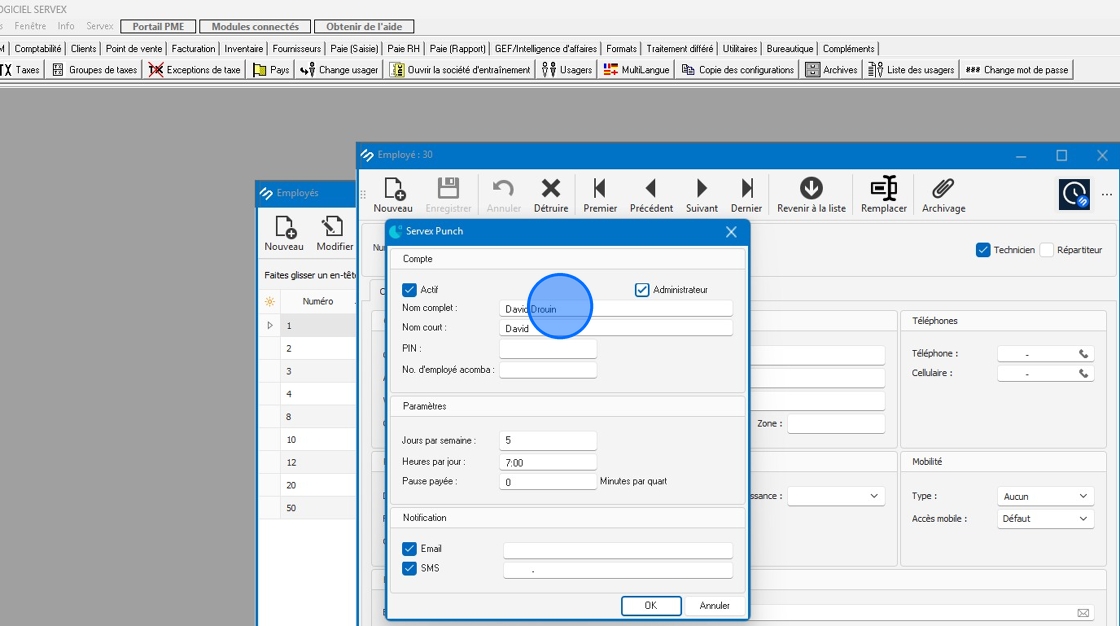 10. Si l'employé est administrateur (approbation des congés, feuilles de temps, etc...), cochez la case "Administrateur"