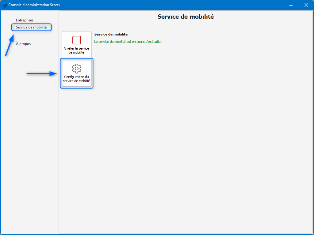 2. Cliquez sur ''Service de mobilité'' et cliquez ensuite sur ''Configuration du service de mobilité''