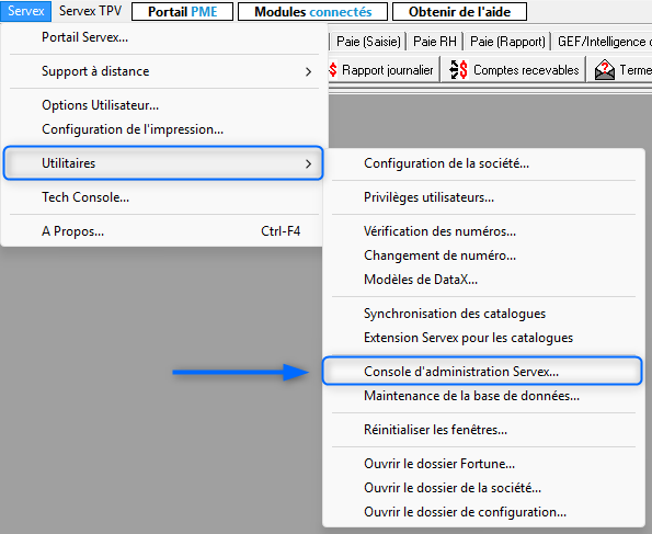 1. Aller dans Servex/Utilitaires/Console d'administration Servex