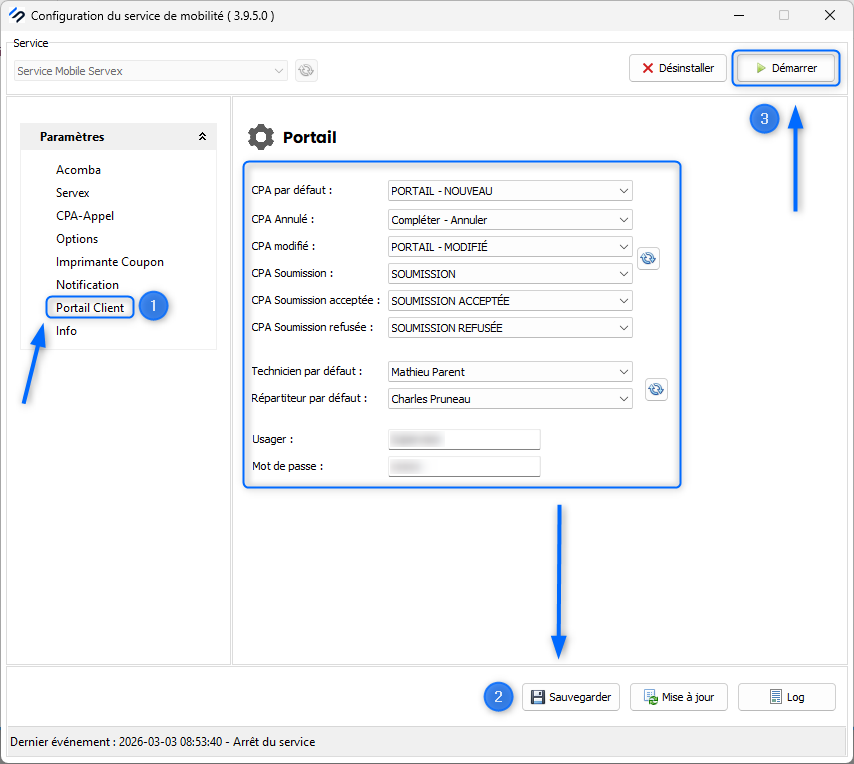 4. Cliquez sur l'onglet ''Portail client'', sélectionnez les informations par défaut, cliquez sur ''Sauvegarder'' et finalement sur ''Démarrer''