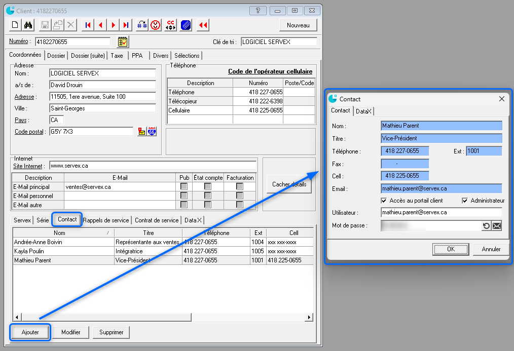 5. Allez dans la/les fiche(s) client(s) à qui vous désirez donner accès au portail puis cliquer sur contact. Inscrire tous les renseignements du contact. *Les espaces en bleu sont des champs utilisés pour l'ouverture des appels à partir du portail. De ce fait, plus la fiche est complète, plus l'ouverture de l'appel de service sera rapide.