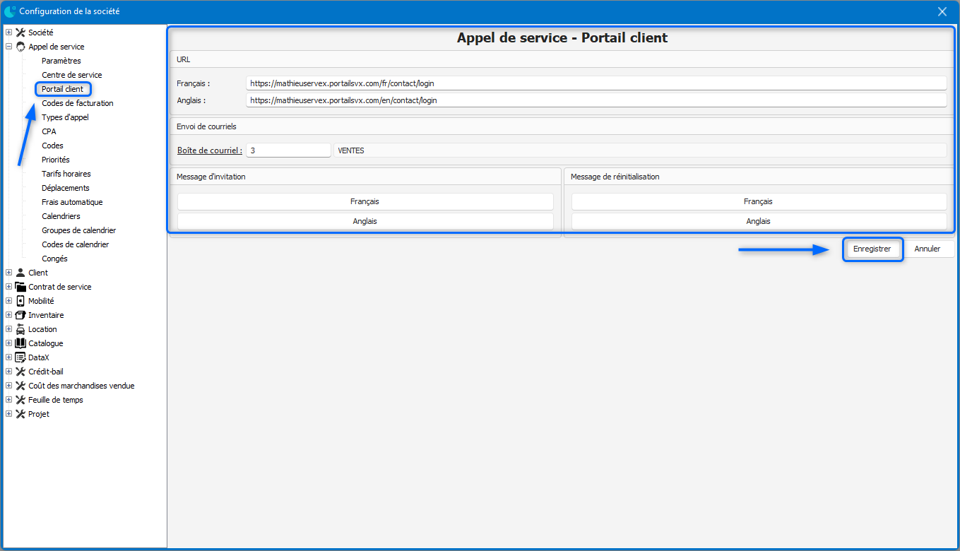 REMARQUE : Pour l'envoi du message d'invitation, vous devez vous assurez que la section ''Portail Client'' dans '' Servex / Utilitaires / Configuration de la société '' , section ''Appel de service'' puis ''Portail Client'' soit bien configuré. Si ce n'est pas le cas, veuillez communiquer avec notre département du support technique au 1.800.522.0655