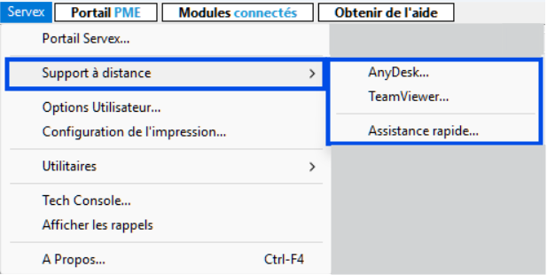 1. Accédez au Support à Distance : Ouvrez le menu Servex et sélectionnez l'option "Support à Distance". Vous y trouverez trois outils différents pour permettre la connexion :
