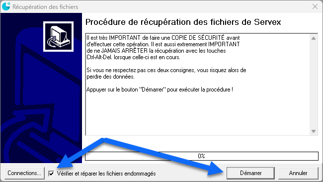 2. Démarrer la récupération : Cliquez sur Démarrer. Cochez 'Vérifier et réparer les fichiers endommagés'