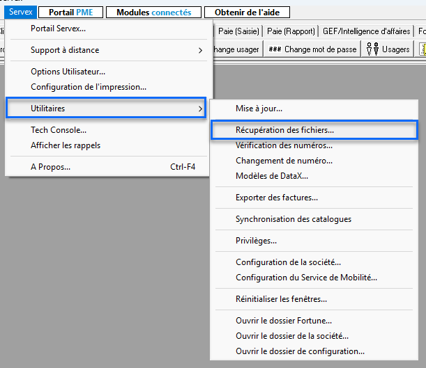 1. Accéder à la récupération des fichiers : Dans le menu du haut, allez à Servex > Utilitaires > Récupération des fichiers.