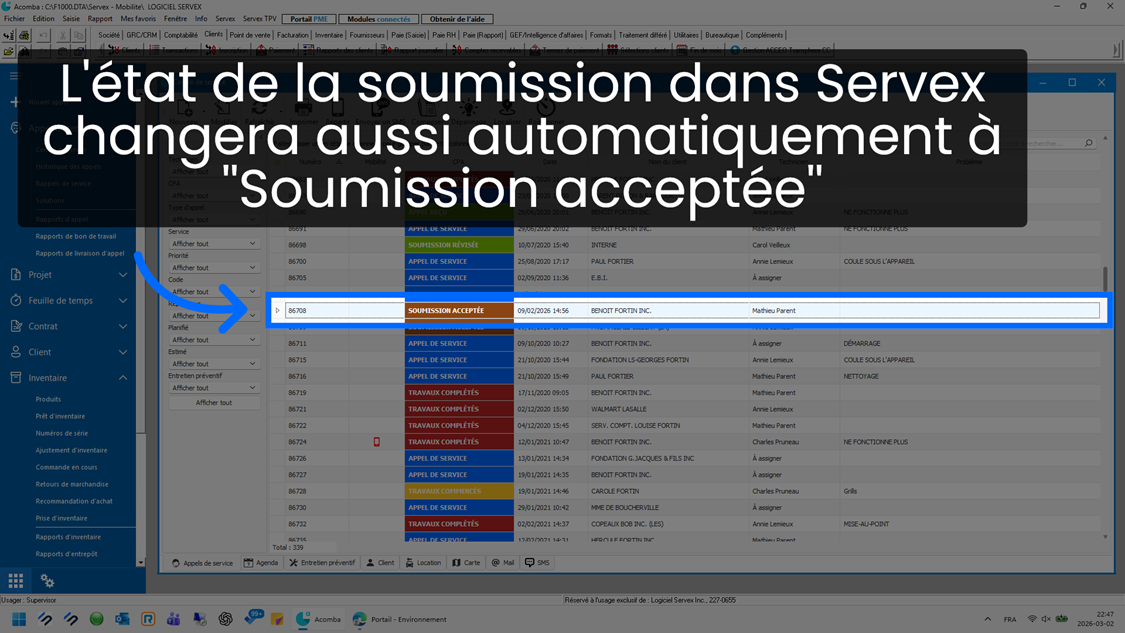 00:27: L'état de la soumission dans Servex changera aussi automatiquement à Soumission accepté