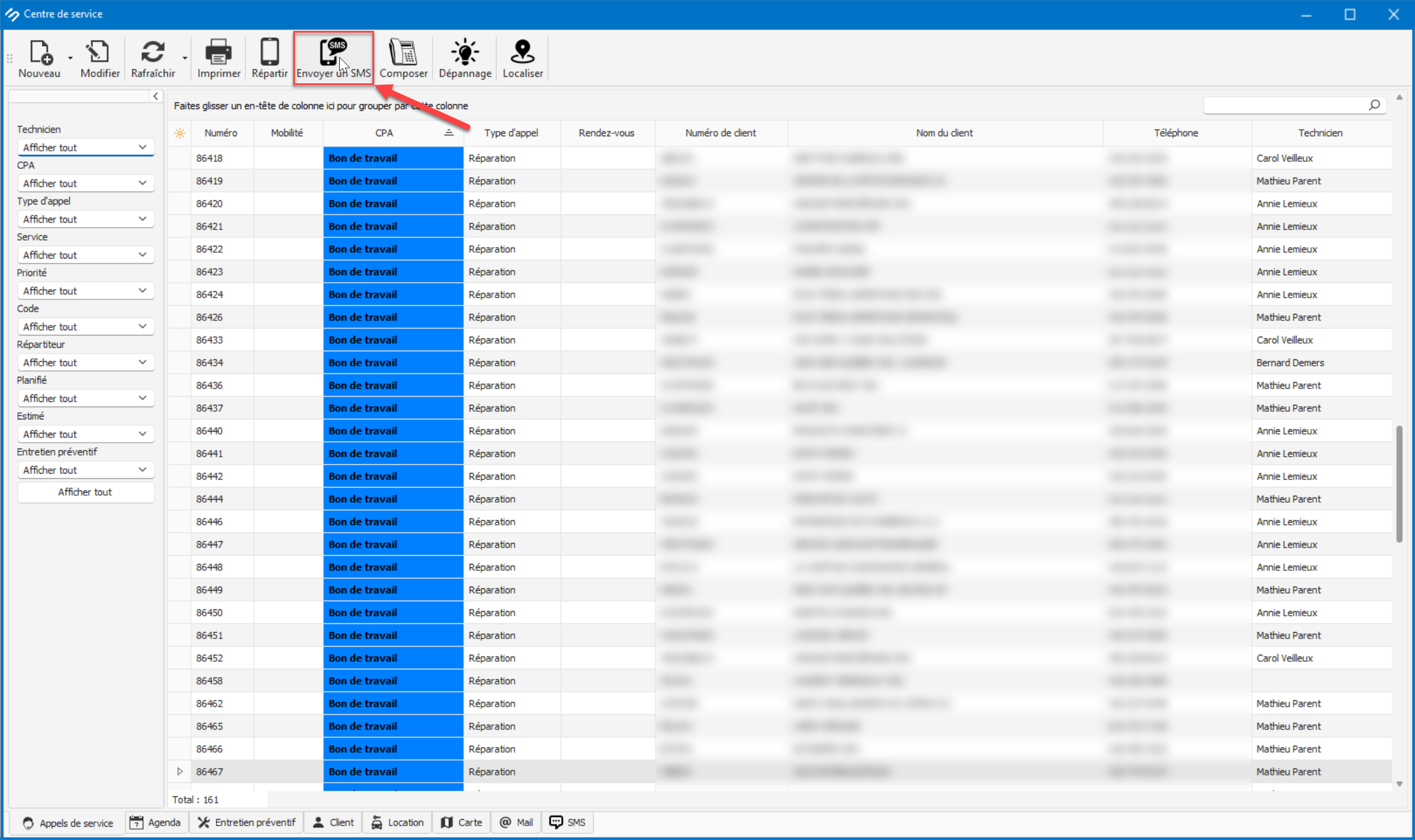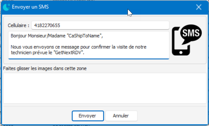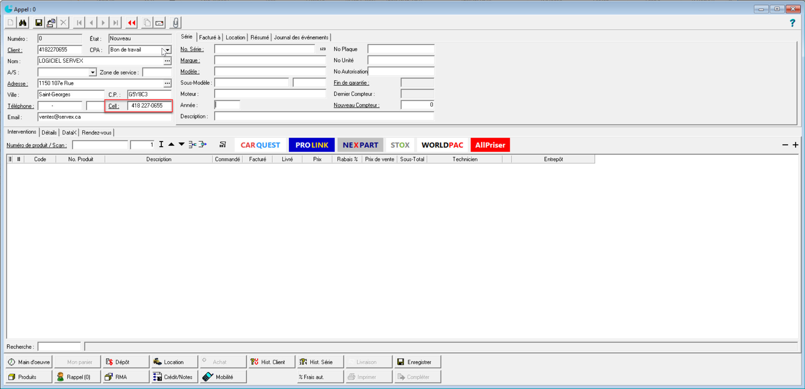 Un champ « Cell » est disponible dans la fenêtre d’appel de service. Inscrivez le numéro de téléphone mobile de votre client dans ce champ afin de pouvoir lui envoyer des SMS.