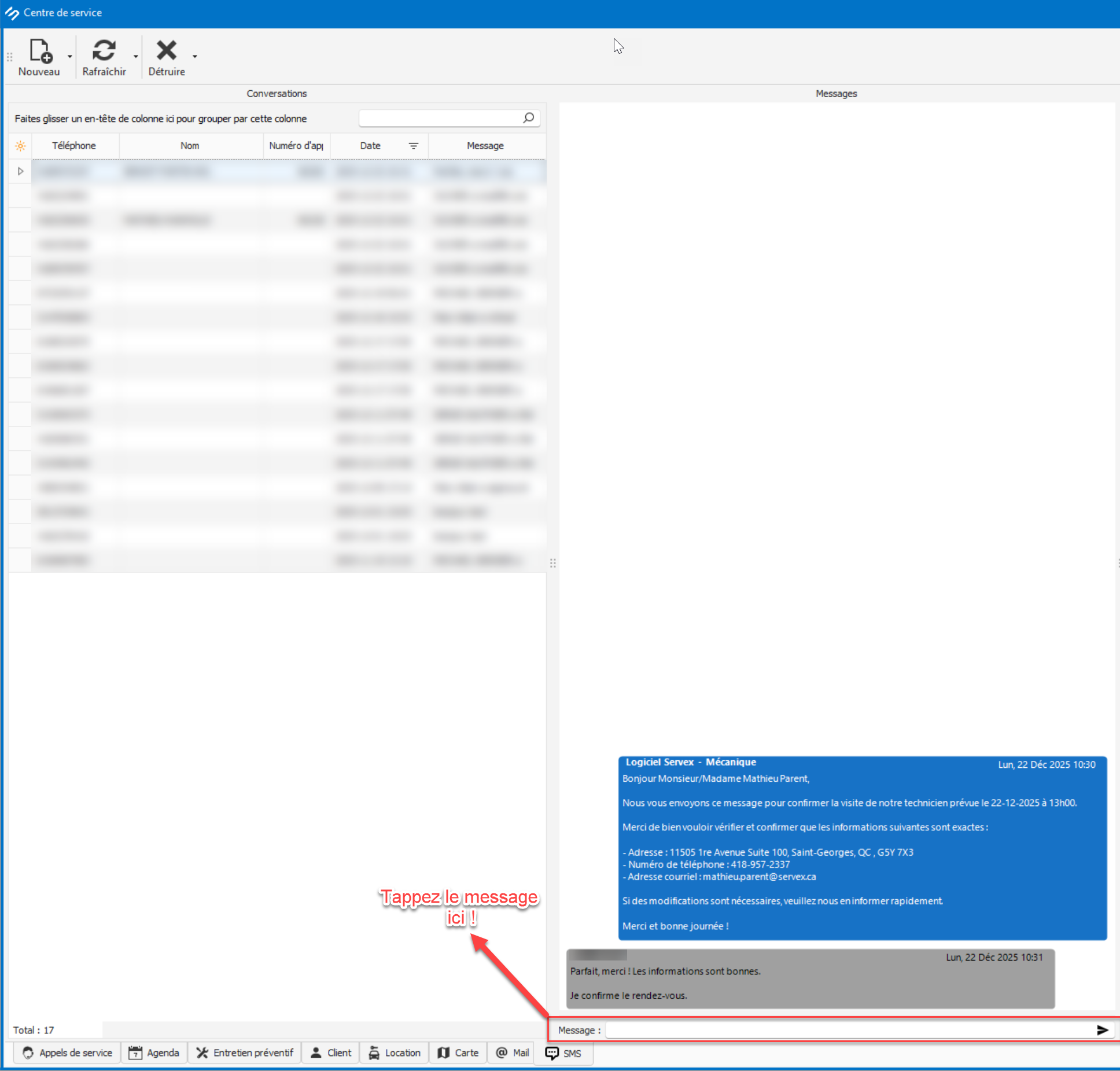 - Cliquez sur le bouton "SMS" en haut du Centre de service. Une fenêtre s'ouvrira vous permettant de saisir manuellement un message à envoyer à votre client.
