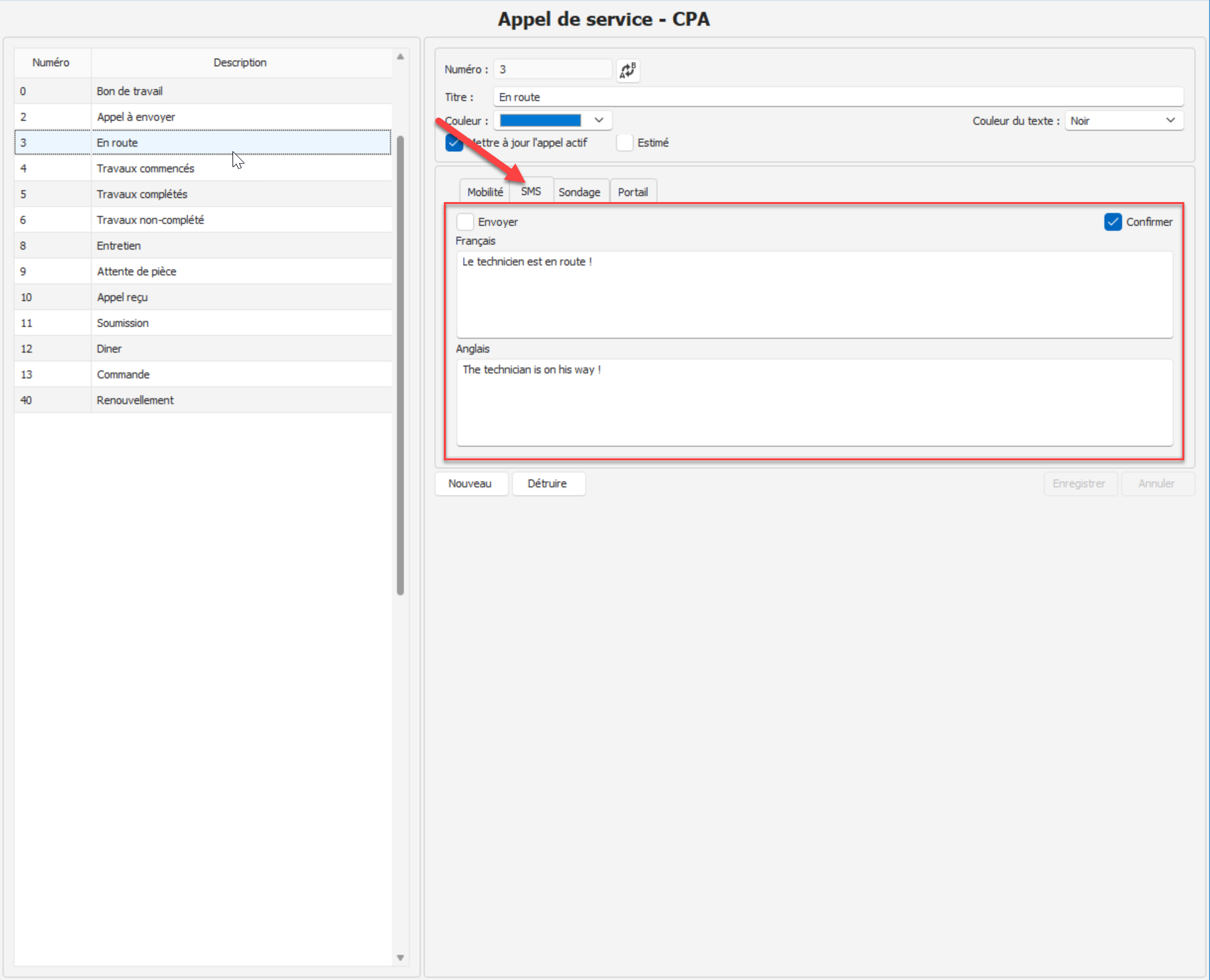 - Cochez cette case pour envoyer un SMS à la sélection de ce CPA (code personnalisé d'appel).