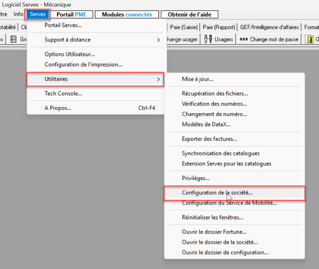 - Allez dans le menu Servex, puis cliquez sur Utilitaires > Configuration de la société > Appel de service > CPA.